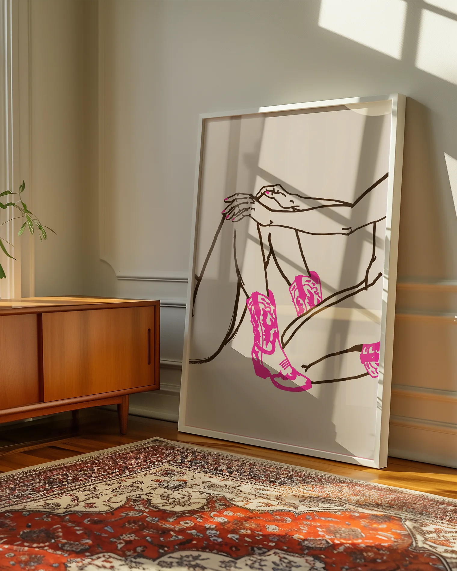 The poster shows two illustrated, naked cowgirls in pink nail polish and matching pink boots in a minimalist lineart style.